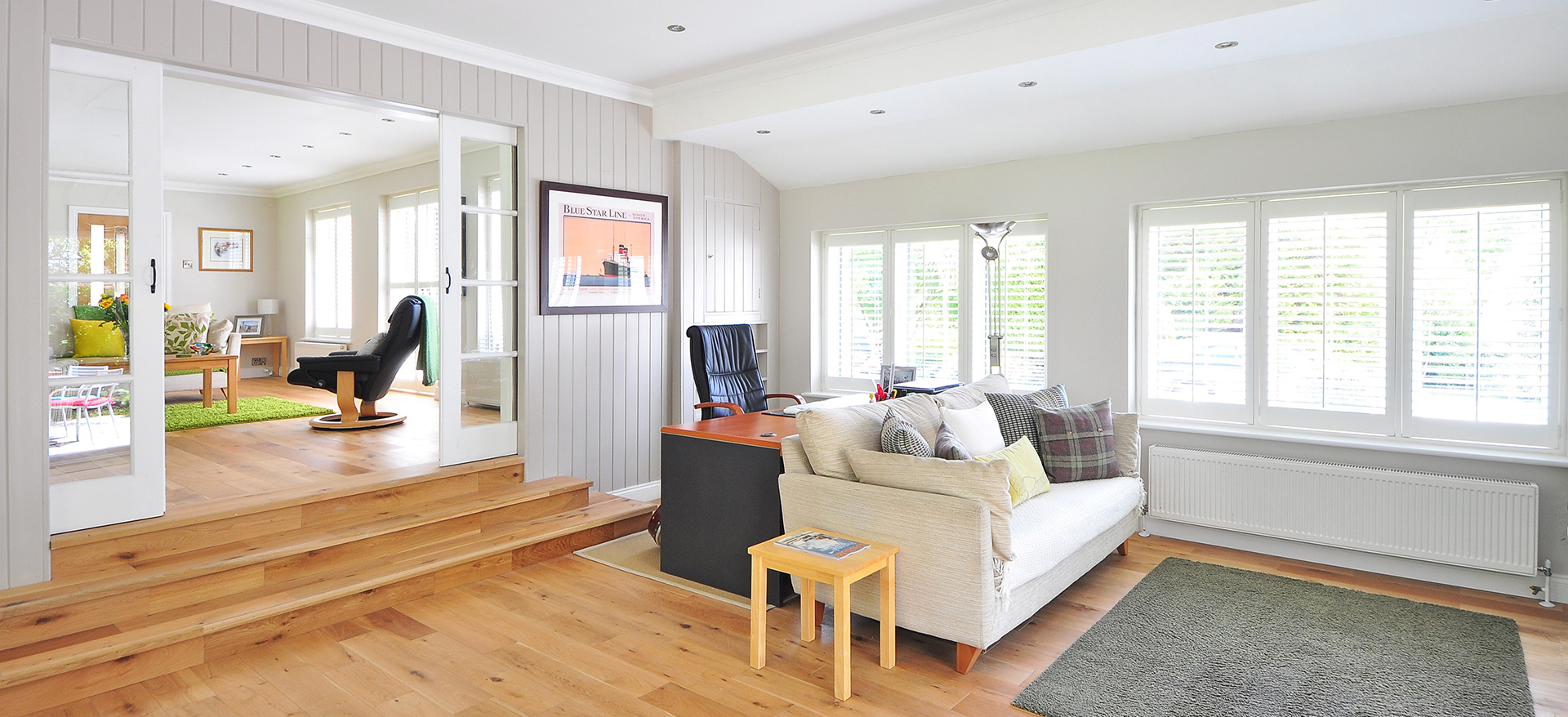 复式楼房层高较普通房屋高,复式装饰以方便在局部掏出夹层并用楼梯连接上下来布置卧室、书房等。